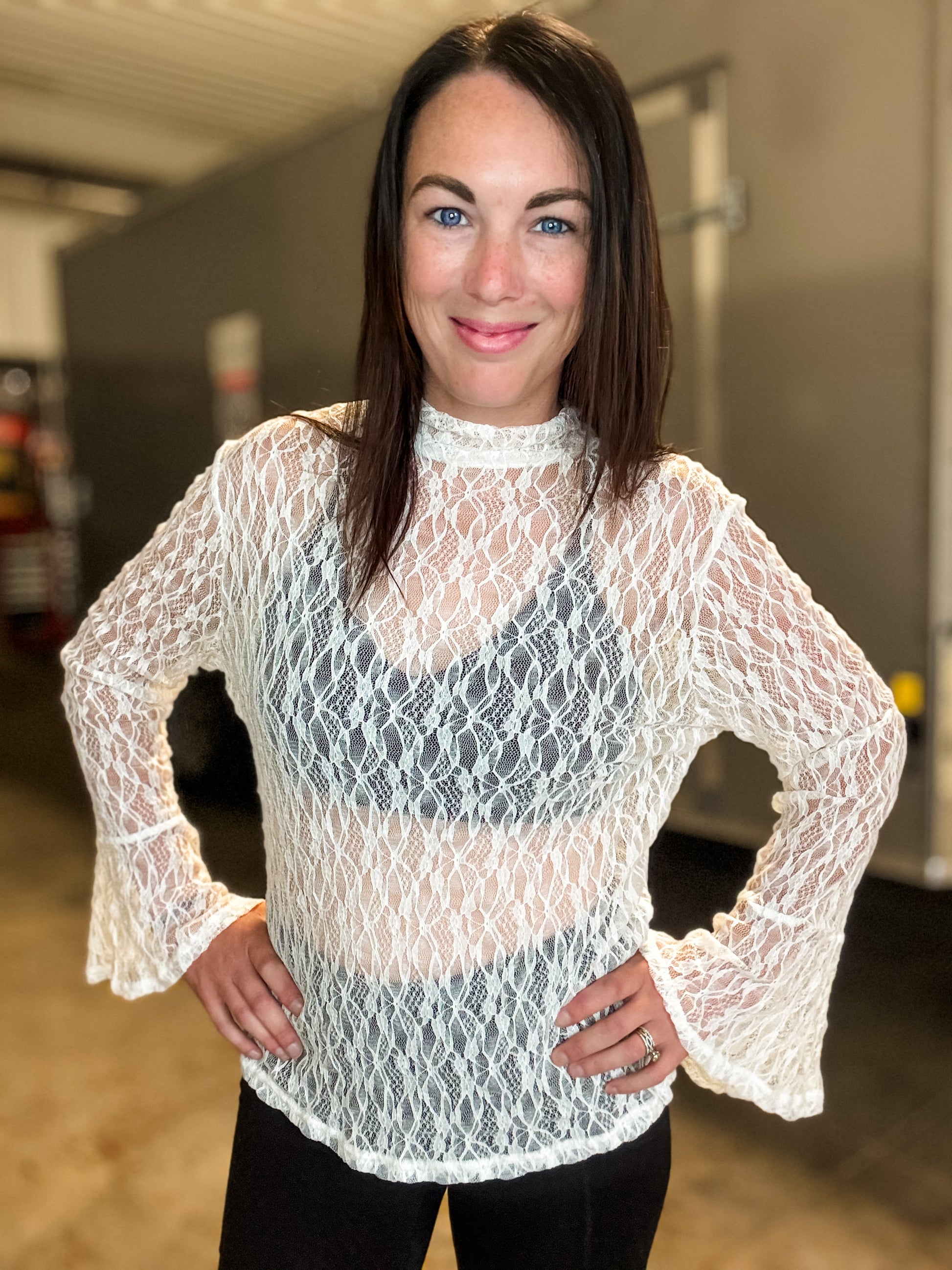 Introducing our Layering Lace Bell Sleeve Top - the perfect blend of sophistication and style. The delicate lace detailing adds an elegant touch, while the sheer fabric subtly reveals skin for a chic look. The bell sleeves create a flattering silhouette, and the mock neck adds a modern twist. Elevate your wardrobe with this must-have piece.